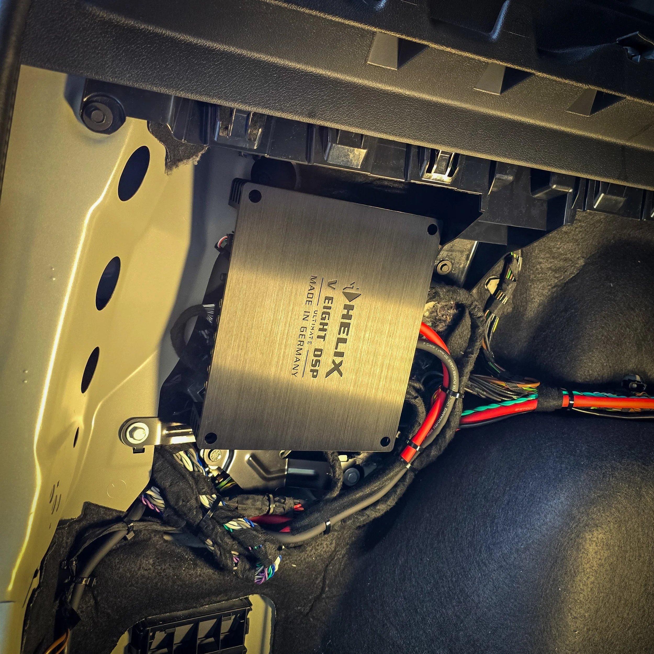 A fully seamless blend of the new Focal K2 power BMW direct fit speakers across the whole car, Helix Ci5 subwoofers under the seat, hidden gem Helix Next V Eight Ultimate with a custom made plug & play harness that fits the factory Harman Kardon amplifier and OEM plus integration of the Helix Conductor with matching LED illumination of the car’s interior.