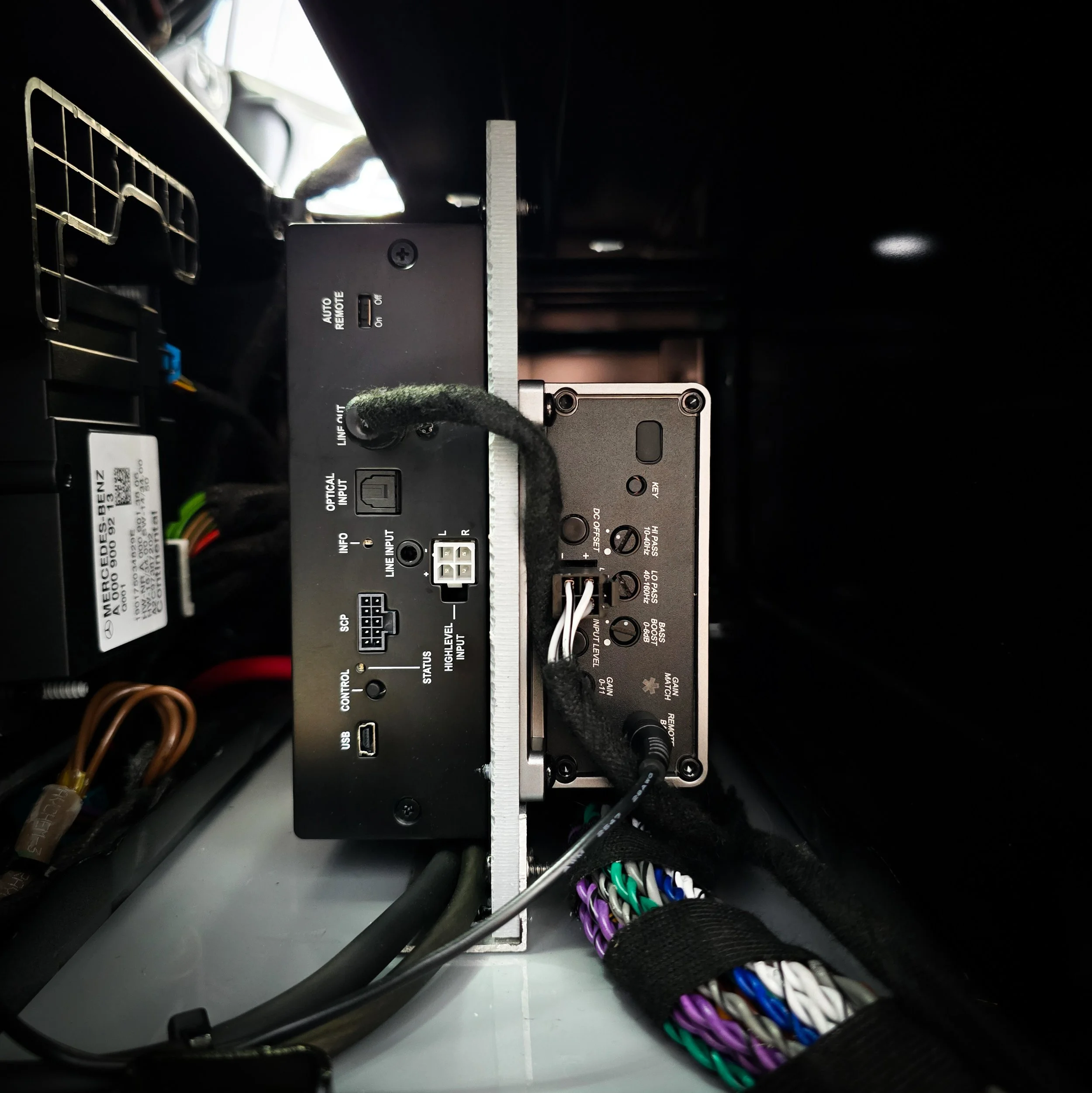 The highlight of this build is the amp rack. Both amplifiers are mounted on a custom fabricated aluminium/PVC bracket behind the passenger seat side panel — the panel itself requires no tools to remove, it pulls off by hand in a second. Everything is immediately revealed and accessible: USB, optical input, line inputs, SCP port, gain controls — all right there.
