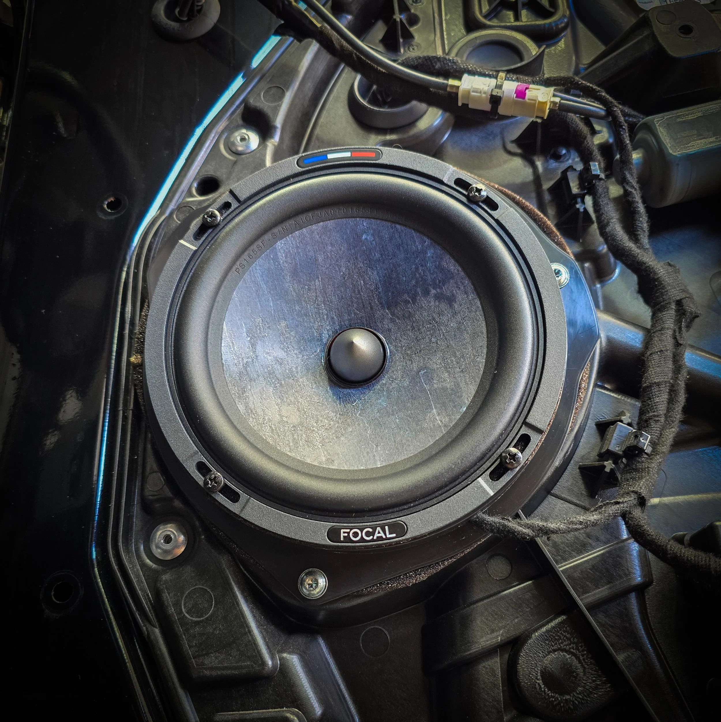 The front stage is a Focal Slate Fiber passive 2-way component set — Focal's slate-loaded fibreglass cone material sits between their entry Flax and upper K2 Power range in terms of character, with good detail retrieval and a natural midrange that suits the relaxed, long-distance feel of a luxury van. Driven properly through the Match UP 10DSP, it opens up considerably from what the factory system offers.