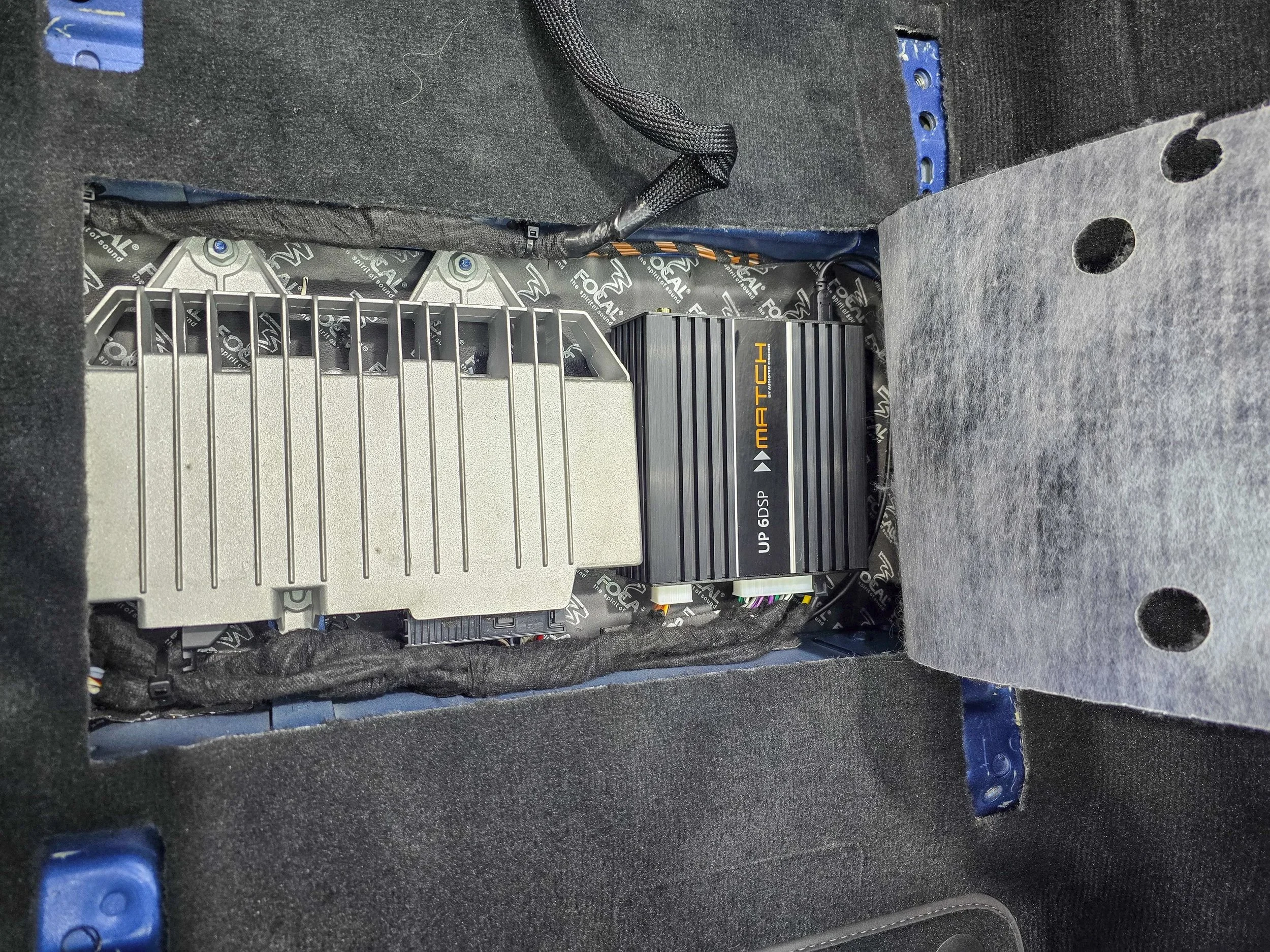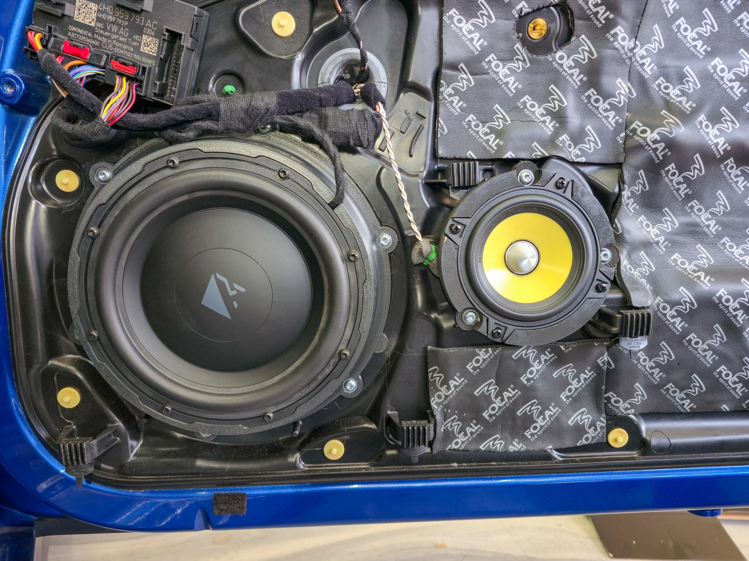 The front stage is Focal K2 Power — mid drivers and tweeters — positioned using custom CNC-machined MDF adapters designed specifically for the 982 door locations. Precision-cut, black painted, and shaped to hold the K2 Power mids at the correct angle and depth for the door cavity. The kind of detail that doesn't show once the trim goes back on but makes a measurable difference to imaging and midrange clarity.