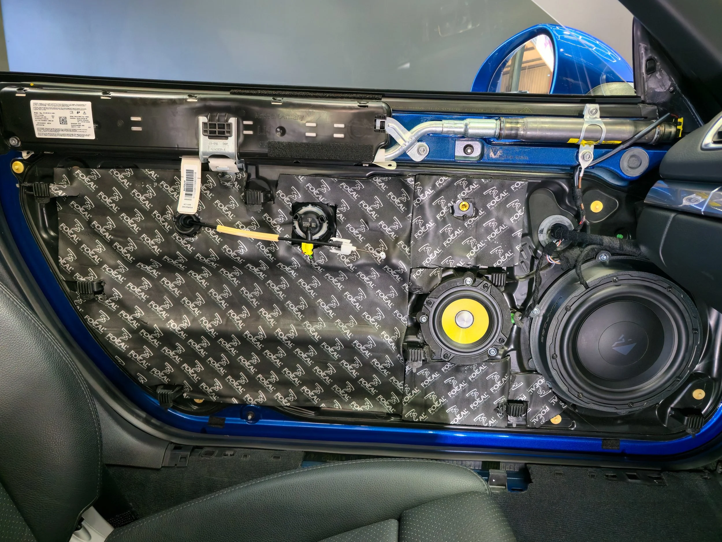 Full Focal B.A.M. butyl membrane treatment went into both doors before anything else — inner skin, outer skin, full coverage. Done properly, a B.A.M.-treated door cavity on a car like the Boxster becomes a sealed acoustic enclosure in its own right. That's what made it possible to run Helix Ci5 slim subwoofers in the doors and get genuine bass response without a dedicated subwoofer box anywhere in the car. No boot space lost, no compromise on output.