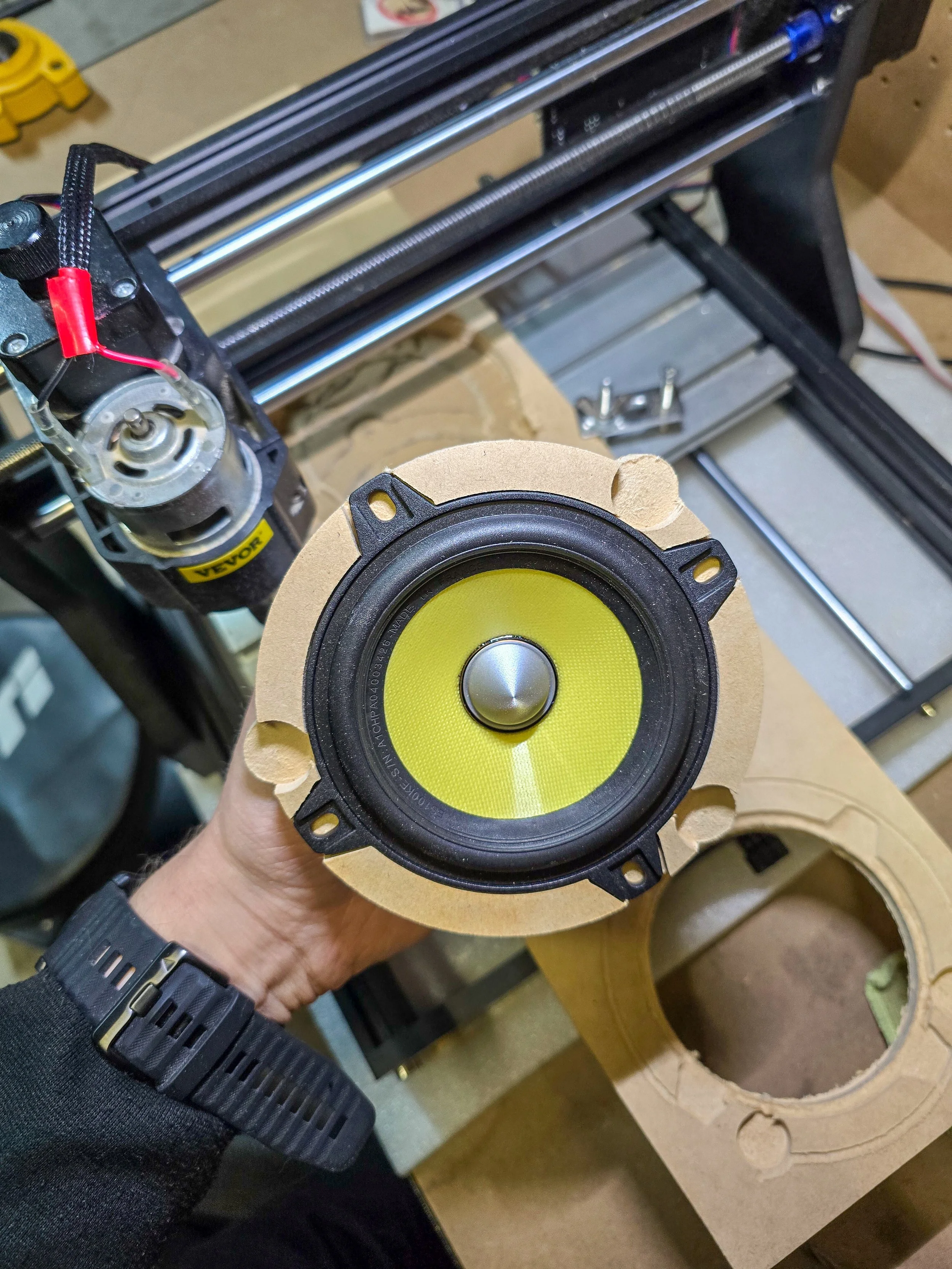 Custom CNC-machined MDF speaker adapters — K2 Power mid locations