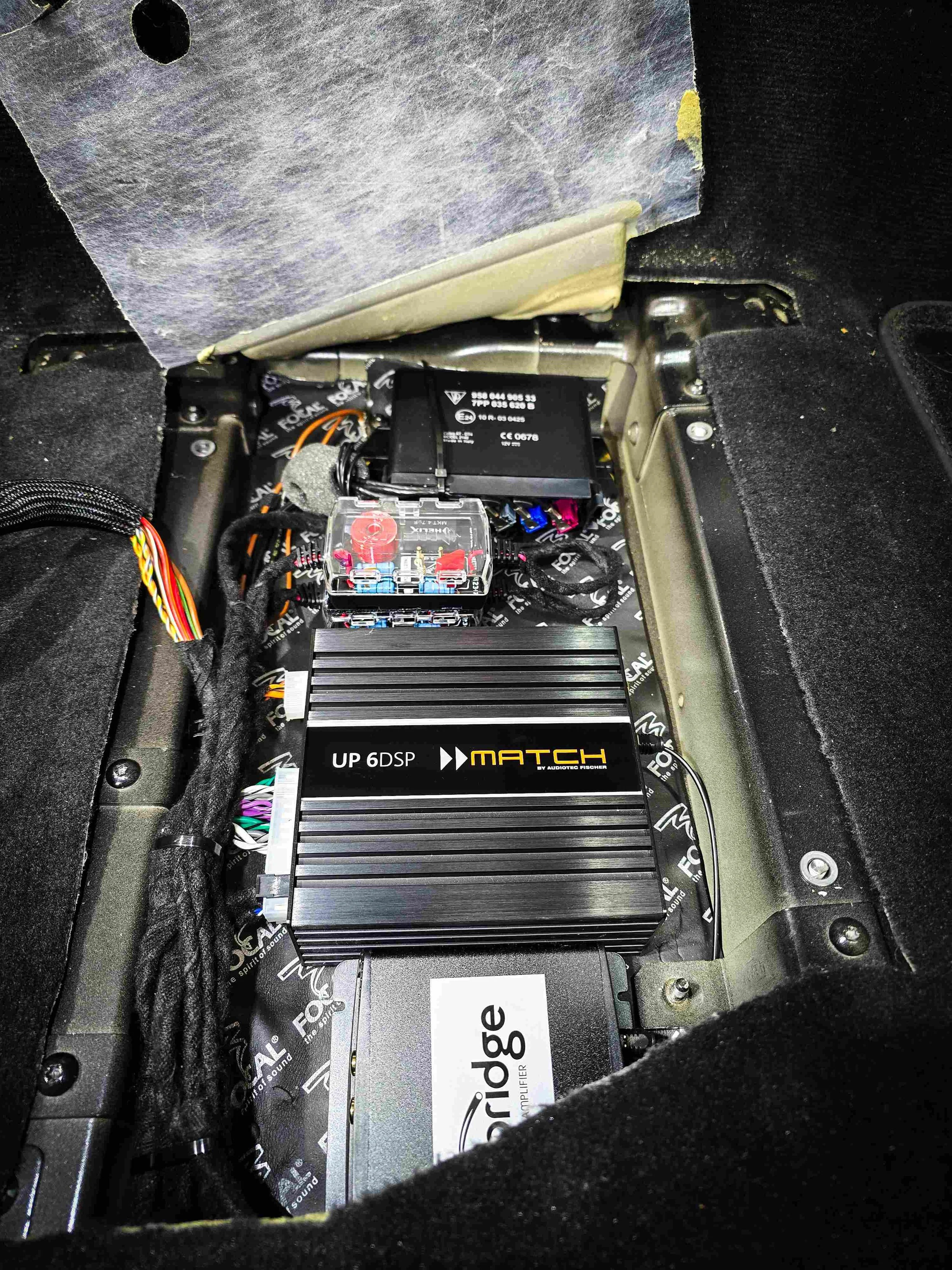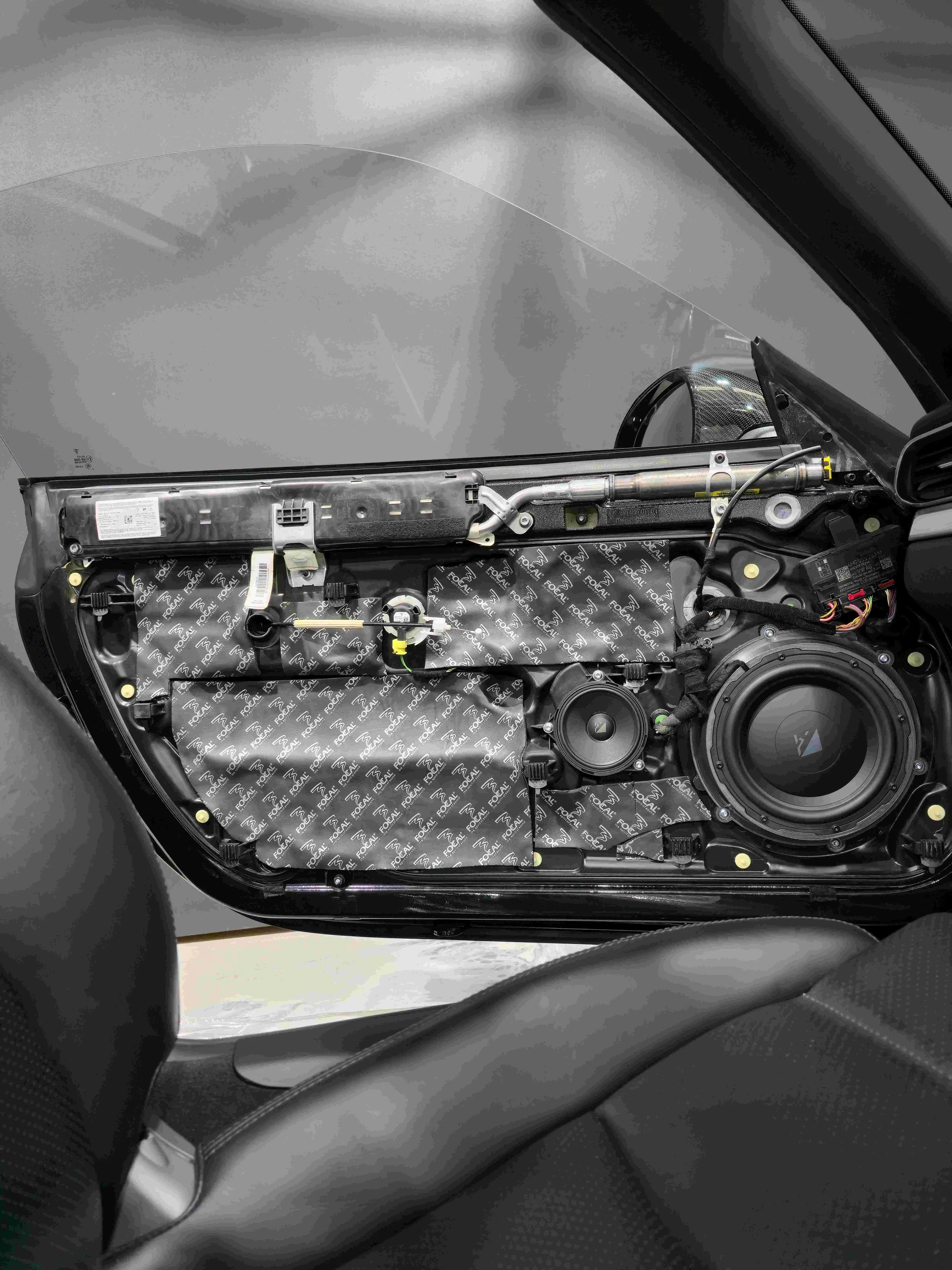 A full system that started from scratch - we got rid of the BOSE amp, replacing it with a MOST25 DA-G2 optical converter and Match UP 6DSP amplifier for pure sound. We have completely re-designed the purpose of the factory doors by using Focal BAM soundproofing on both the inside door panel and outer door panel, effectively creating a fully airtight subwoofer enlosure with an absolute minimum of vibrations. Helix Ci3 speakers and Ci5 subwoofers - possible to change to Focal K2 powers as well. This is our signature Porsche upgrade solution that we’ve done on many 911 and other Porsche models - absolutely loved by Sydney Porsche owners