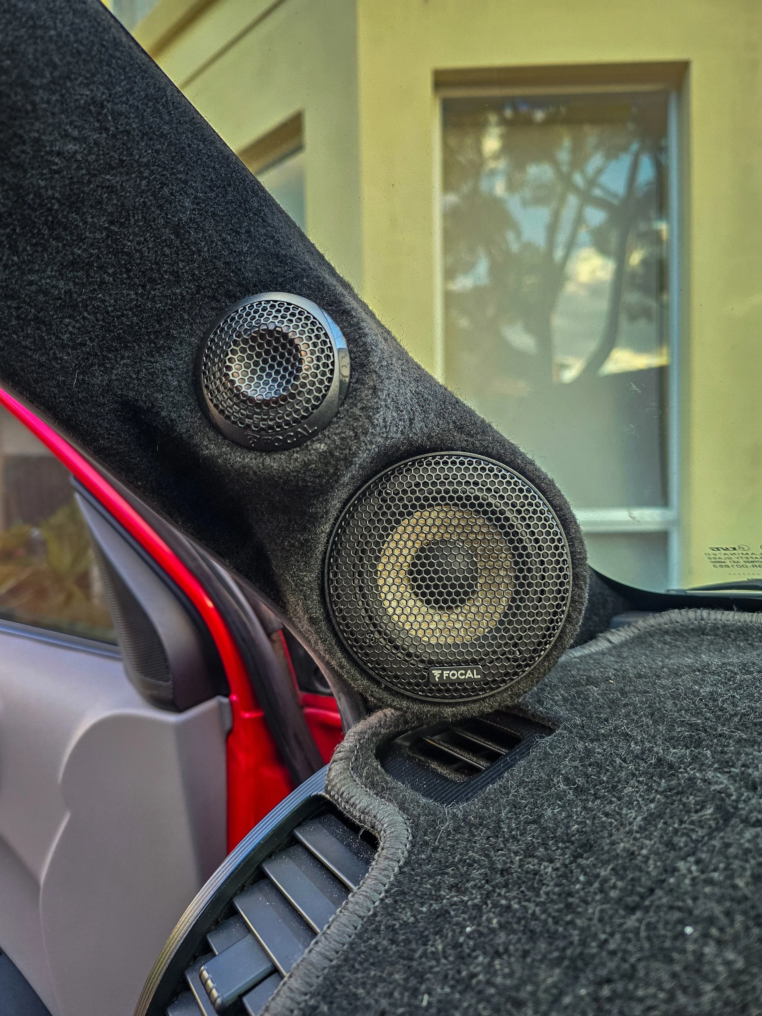 The A-pillars are custom-fabricated, shaped to position the Focal tweeters and midrange drivers aimed directly at the listening position. Getting the staging right on a dual-cab is genuinely difficult — the wide dash and elevated seating height work against you. The custom pillars solve that properly rather than working around it with EQ.