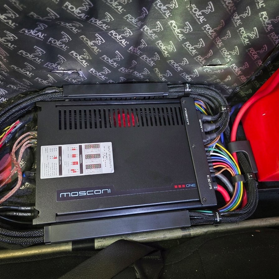 The Mosconi One 8|30 DSP runs everything. It's a class AB amplifier with an integrated 8-channel DSP, and class AB is a deliberate choice here — the warmth and linearity of AB amplification suits the Focal Flax Evo drivers in a way that class D doesn't always replicate. Each driver — tweeter, midrange, and woofer — runs on its own dedicated amplifier channel with independent crossover slopes, time alignment, and level control. There are no passive crossovers in the signal path at all.