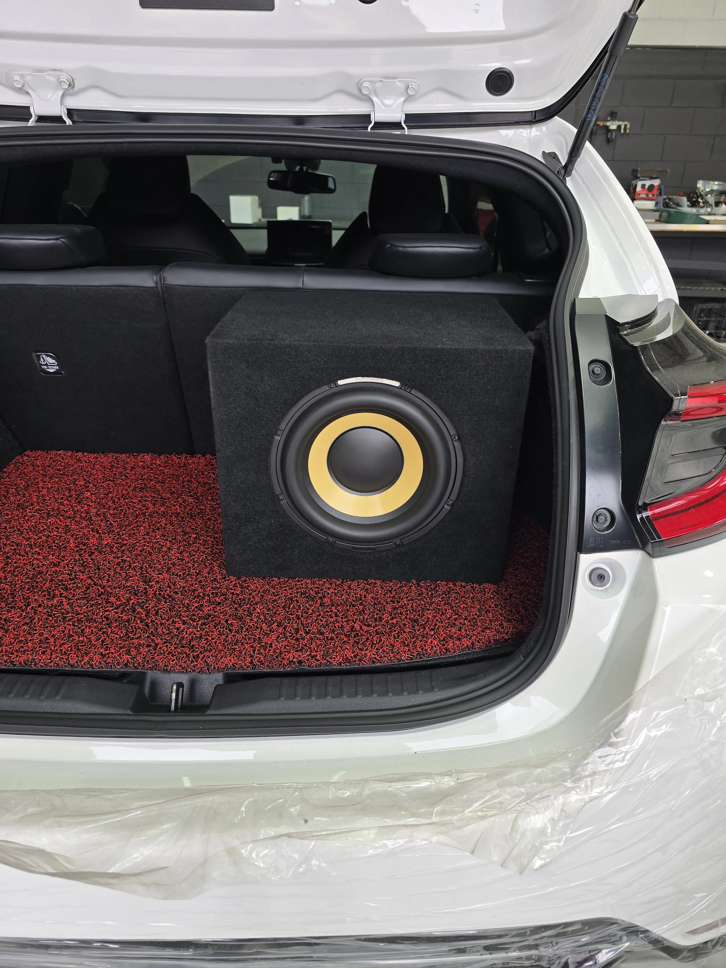 Bass comes from a Focal K2 Power 10-inch driver in a custom-built subwoofer enclosure — handmade from 18mm MDF, triple-laminated with structural wood glue, properly carpeted, and pre-drilled for the driver. Built in Australia, built to last. The GR Yaris boot is compact, so the box was designed to fill it efficiently without sacrificing output or tuning flexibility.