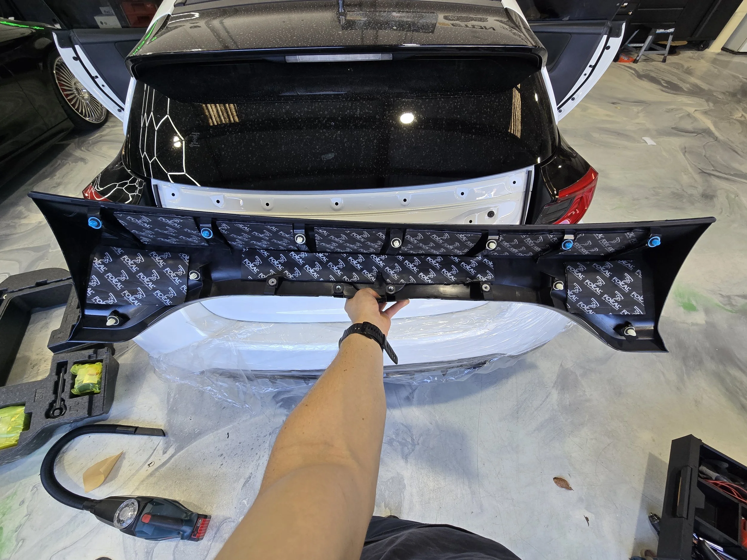 Soundproofing was comprehensive. Focal B.A.M. went into the doors as standard, but this car needed more — floors, boot, rear plastic covers, A, B and C-pillars, and the rear view mirror housing all got treated. The process involved playing specific test tones and frequencies in the car after each stage to locate remaining resonance points before moving on. It's the kind of methodical approach that separates a quiet system from a system that stays quiet when the bass hits hard.