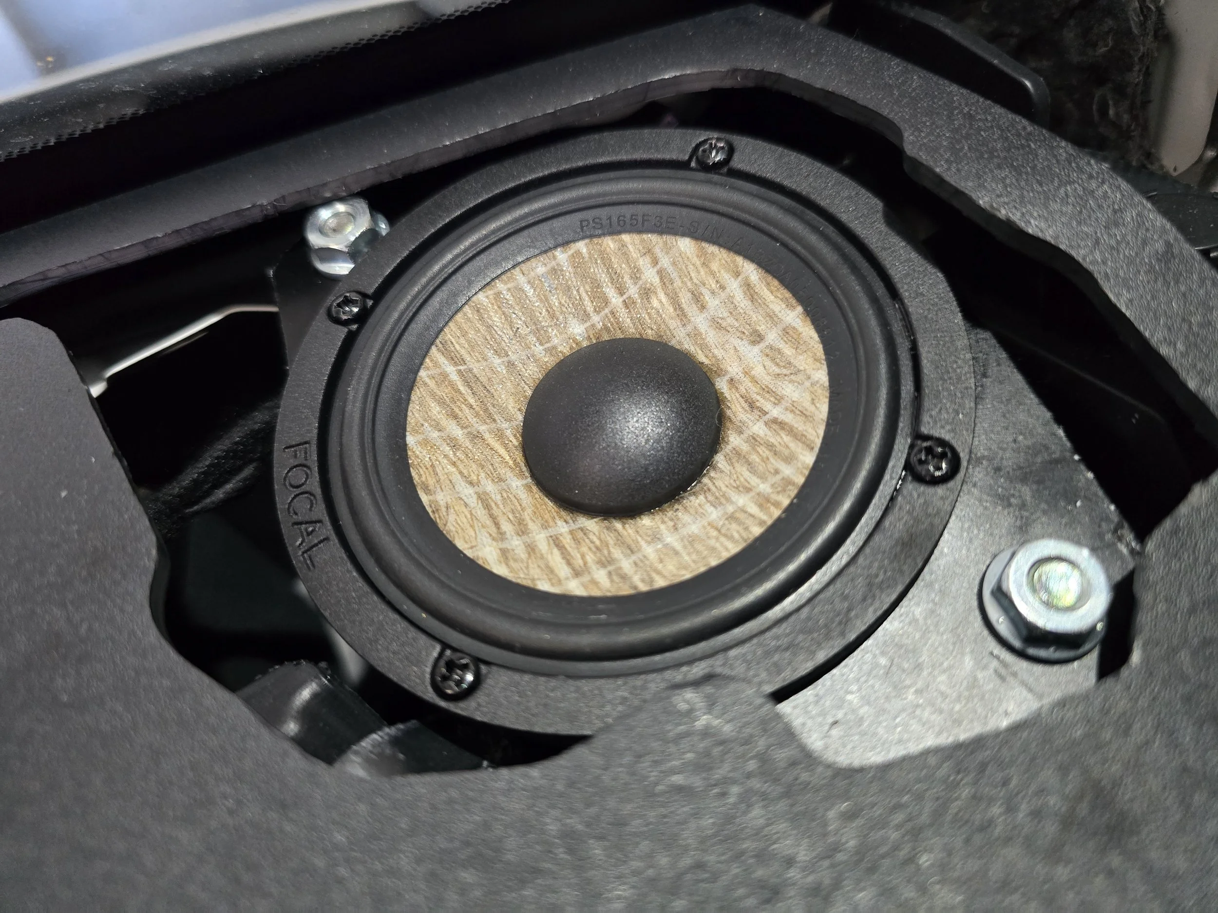 The front stage is a fully active 3-way Focal Flax setup — tweeter, midrange, and woofer each running on independent amplifier channels through the Helix Next V Eight DSP. No passive crossovers, full DSP control over time alignment, crossover slopes, phase, and EQ. Focal Slate Fiber coaxials cover the rear. The Flax series is worth calling out here — it sits at a price point that undersells what it actually does. Precise, natural, and unfatiguing at any volume. For a car you're going to drive hard and listen to seriously, it's the right choice.