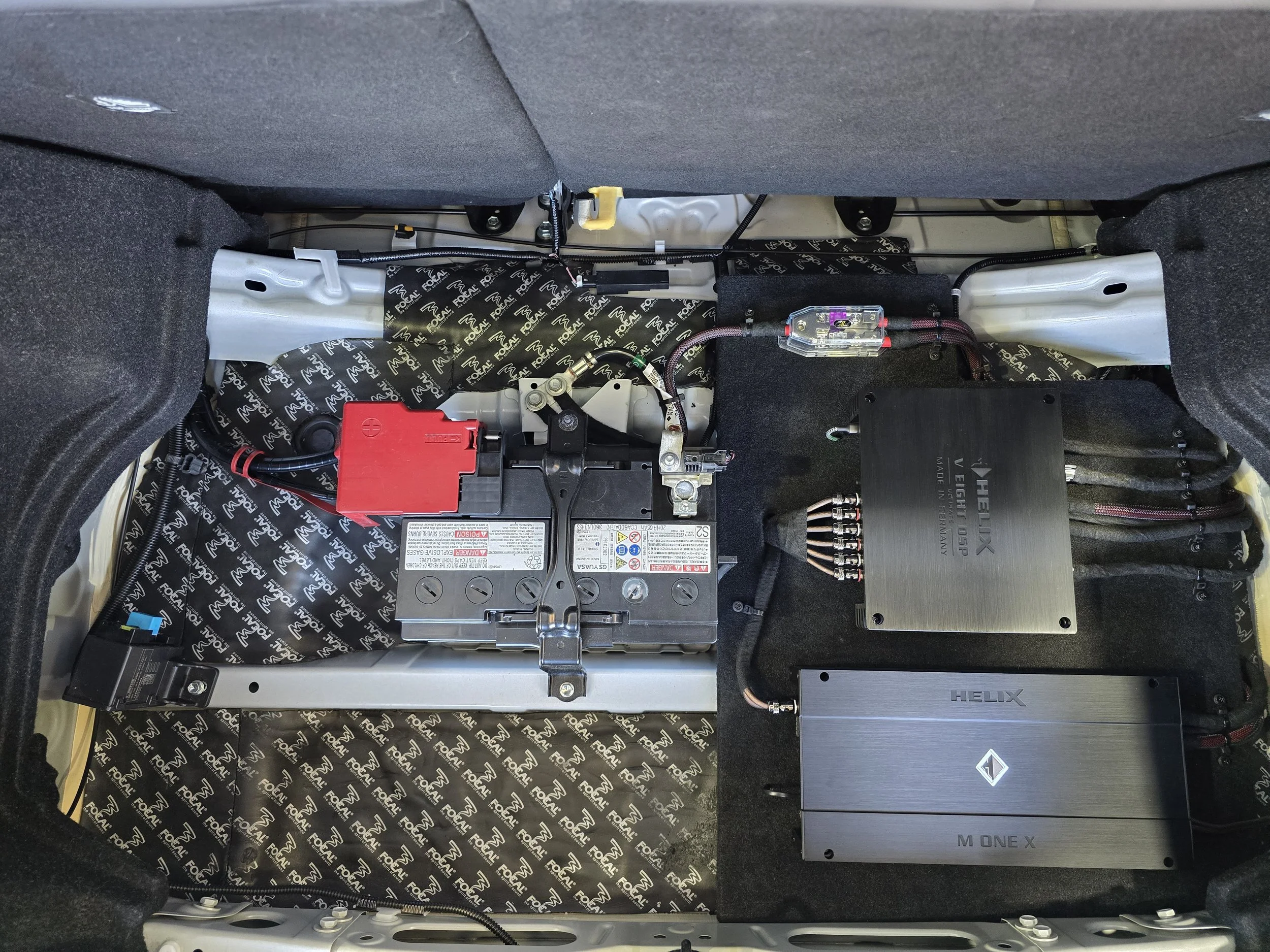 The Helix Next V Eight DSP handles all the 8 speakers actively — a serious piece of kit with genuine flexibility across input configuration, output routing, and DSP processing depth. The tune on this car was built for a clean, precise front stage that can still deliver real bass impact when asked. Not vibration. Bass.
